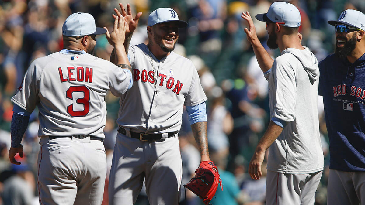 Sox players celebrated their win over the Mariners Sunday. (Lindsey Wasson/Getty Images)