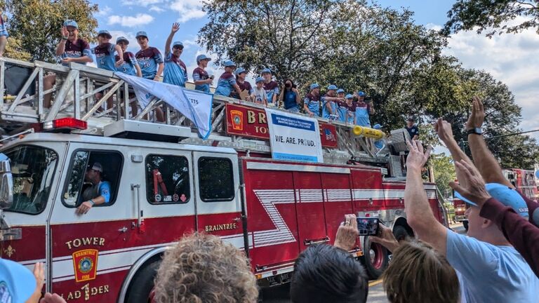 On Sunday, the players rode on top of a fire truck as supporters lined the streets. Mayor Erin Joyce congratulated the team at a ceremony at Braintree Town Hall, where there was also a giant cake to celebrate.