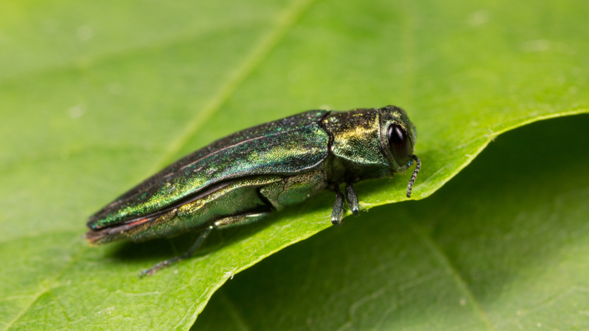An invasive Emerald Ash Borer perched on a leaf. Photo: Getty Images