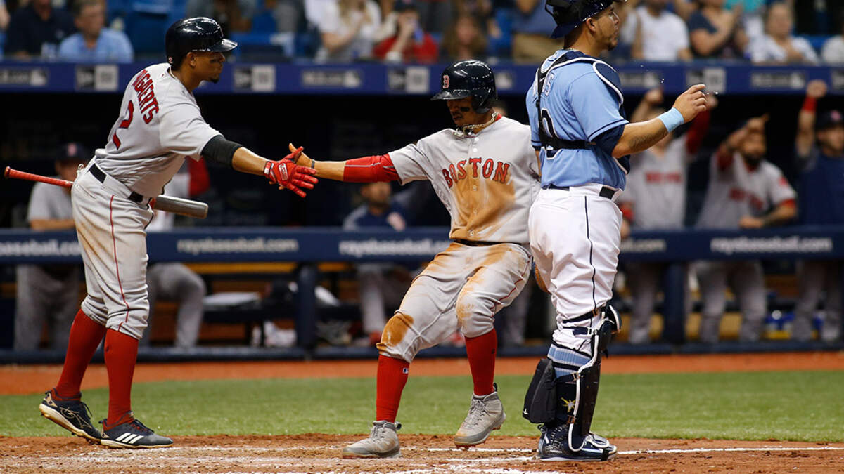 Mookie Betts and Xander Bogaerts celebrate during an Easter Sunday game against the Rays. (Brian Blanco/Getty Images)