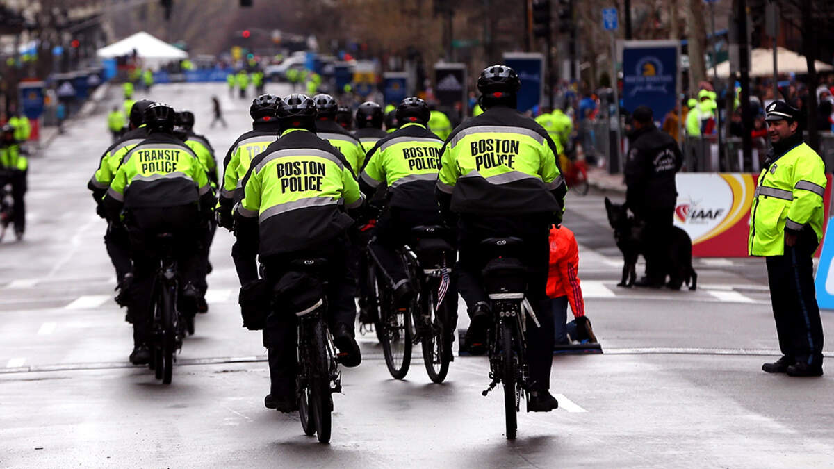 Security on the route of the Boston Marathon in 2015. (Jim Rogash/Getty Images)