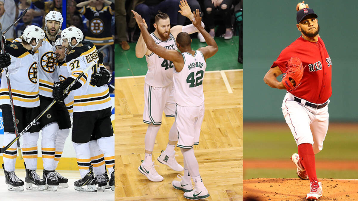 Bruins celebrate during Game 1 against the Lightning; Aron Baynes and Al Horford high-five during Game 7 against the Bucks; Eduardo Rodriguez will pitch against the Royals. (Mike Ehrmann/Getty Images; Maddie Meyer/Getty Images; Adam Glanzman/Getty Images)