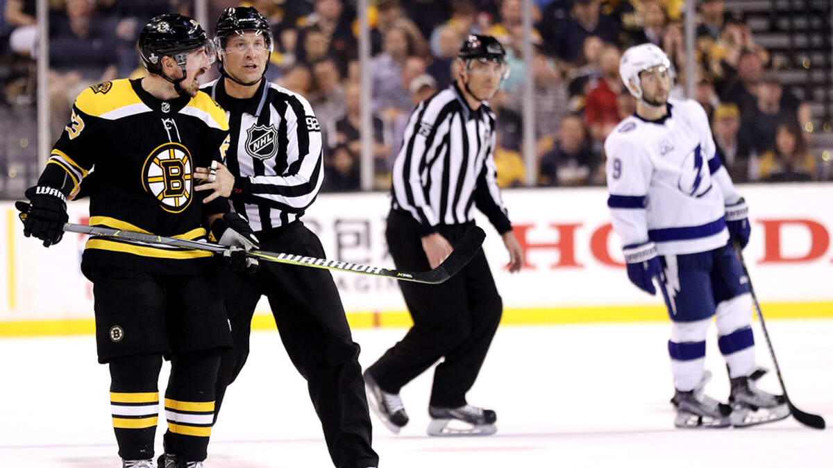 Brad Marchand reacts to a slashing call during Game 3 against the Lightning. (Maddie Meyer/Getty Images)