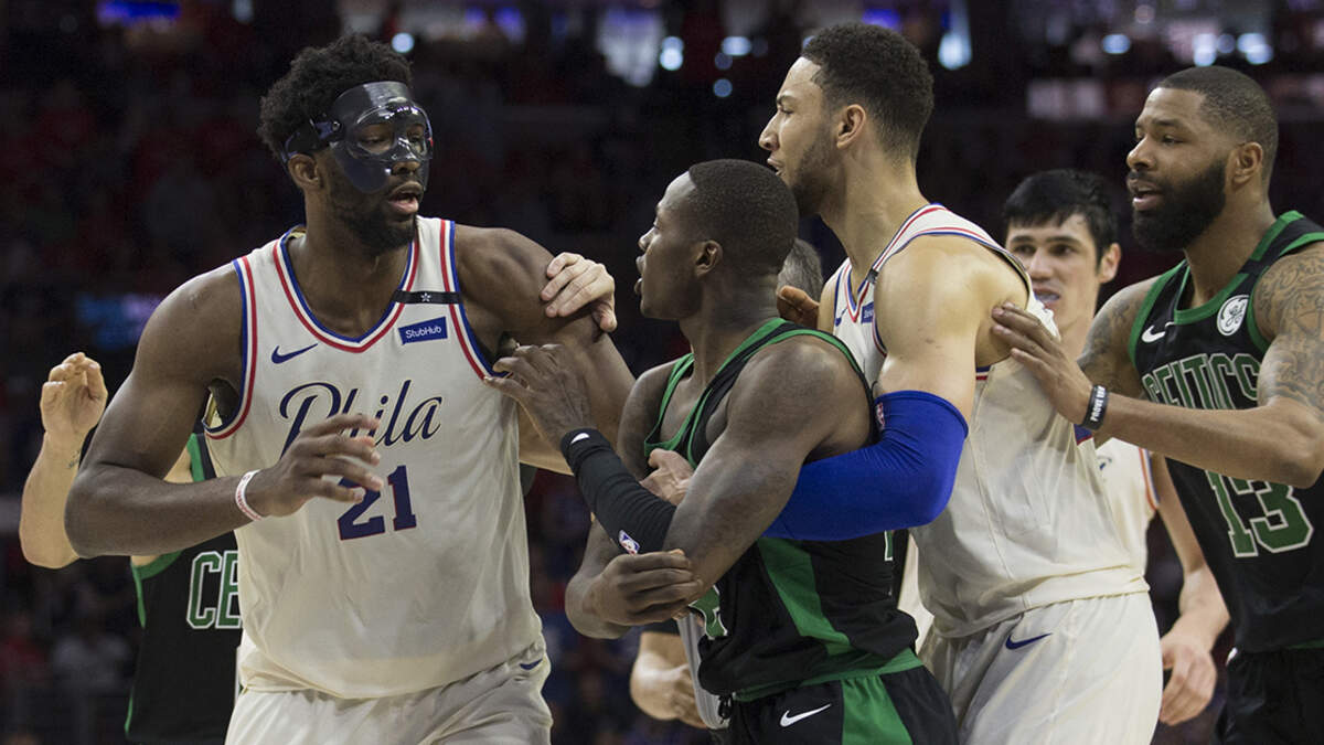 Embiid and Rozier get into an altercation as Jayson Tatum, Marcus Morris, and the 76ers' Ben Simmons try to break them up. (Mitchell Leff/Getty Images)