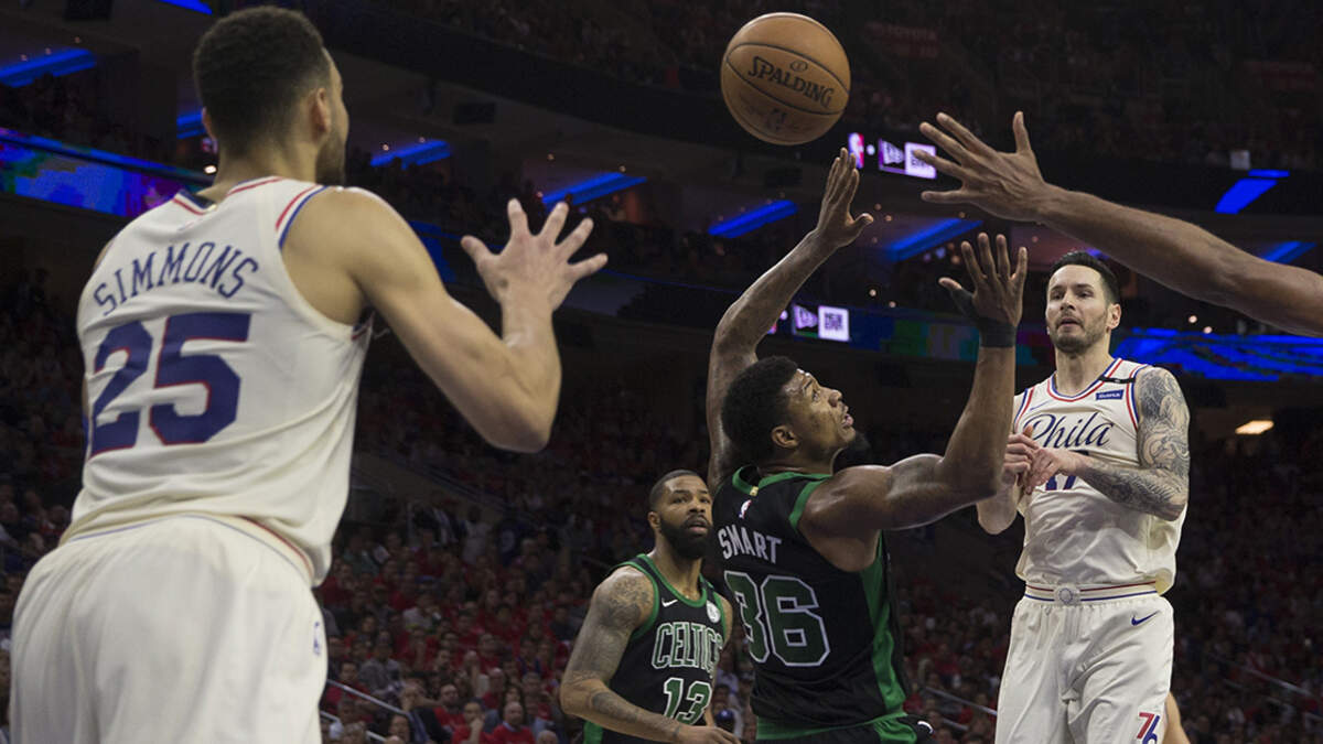 JJ Redick passes to Ben Simmons against Marcus Smart in Game 4. (Mitchell Leff/Getty Images)