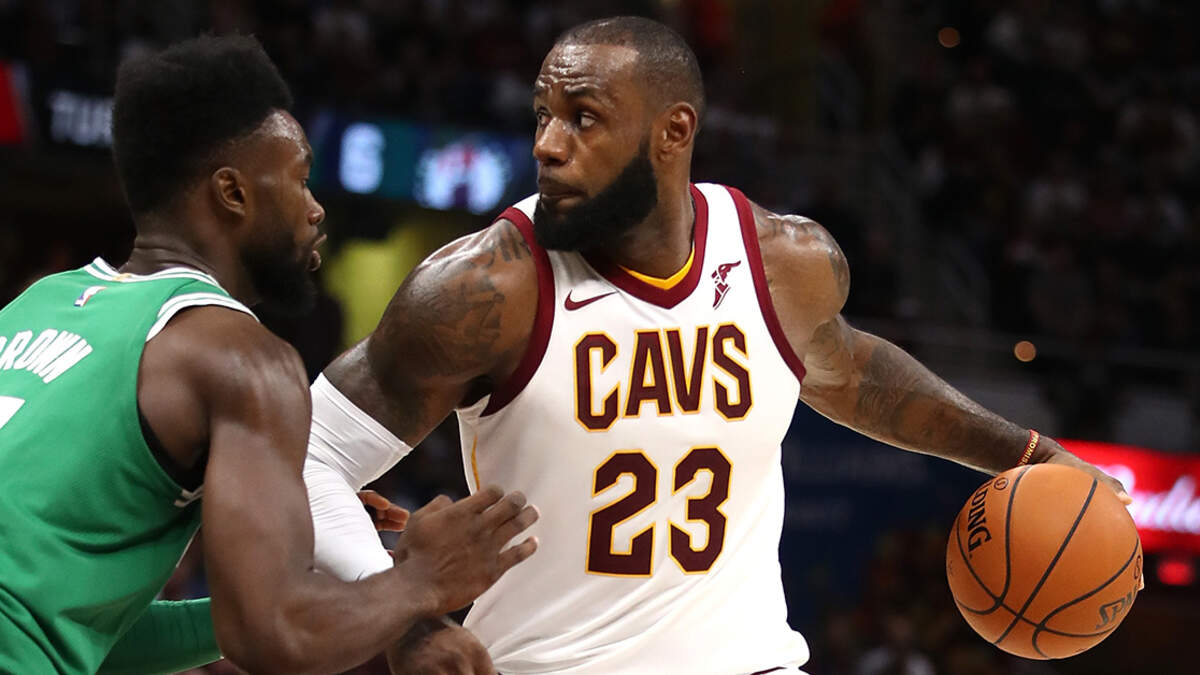 Jaylen Brown guards LeBron James in an October 2017 Celtics-Cavs game. (Gregory Shamus/Getty Images)