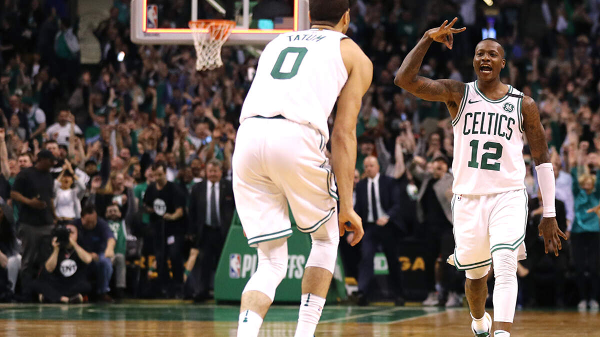 Terry Rozier and Jayson Tatum celebrate after hitting a 3. (Maddie Meyer/Getty Images)