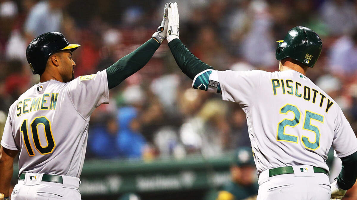 Marcus Semien and Stephen Piscotty high-five. (Adam Glanzman/Getty Images)