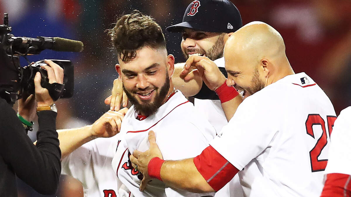 Blake Swihart, mobbed by his teammates after hitting the game-winning walk-off ground-rule double. (Adam Glanzman/Getty Images)