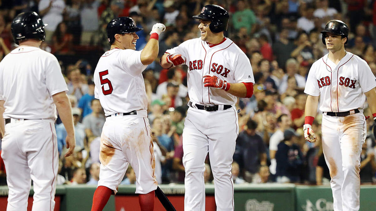 Steve Pearce high-fives Ian Kinsler. (Adam Glanzman/Getty Images)