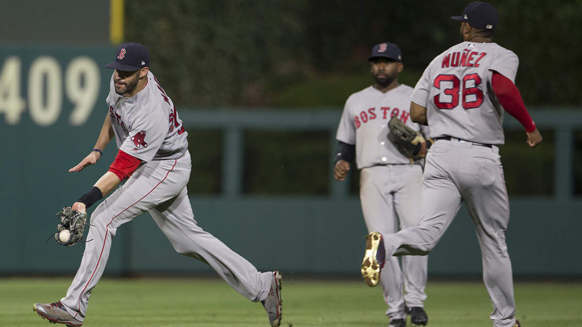 J.D. Martinez makes a running catch in front of Jackie Bradley Jr. and Eduardo Nunez. (Mitchell Leff/Getty Images)