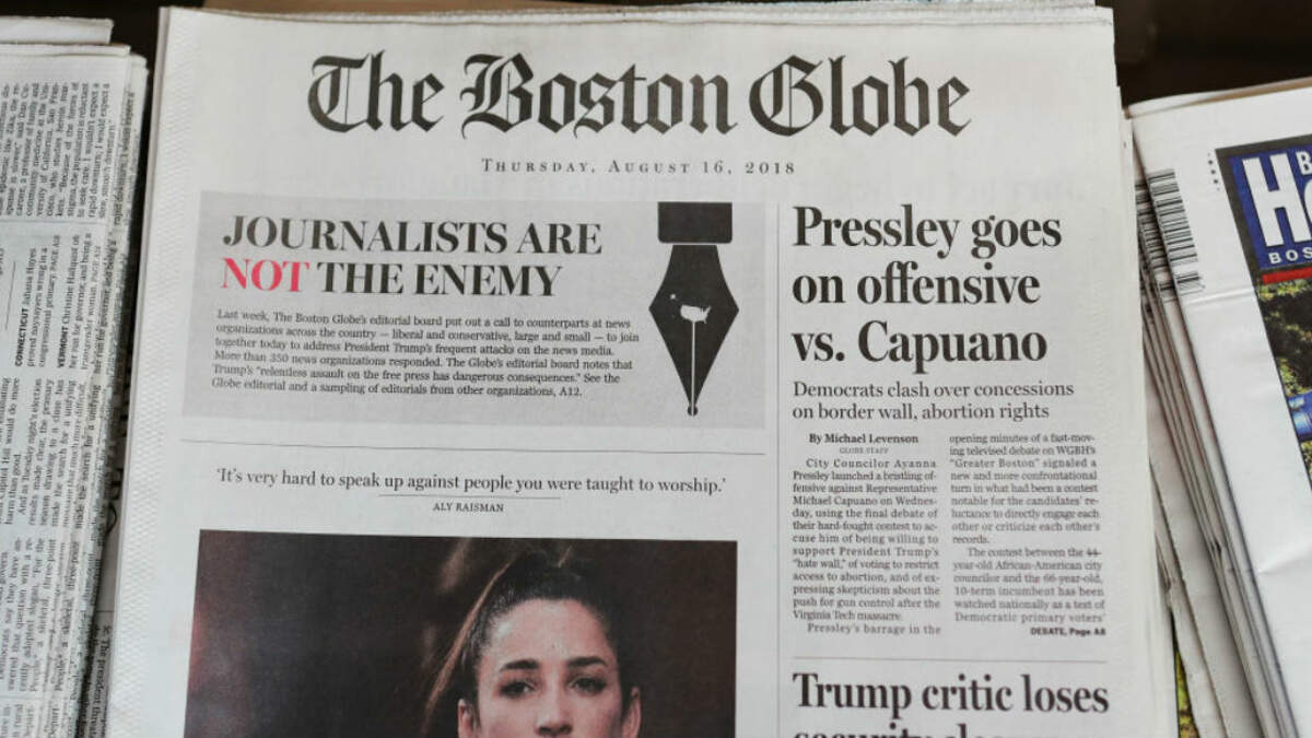 CAMBRIDGE, MA - AUGUST 16: The front page of the Thursday, August 16, 2018 edition of the Boston Globe newspaper reads 'Journalists are Not the Enemy' as it sits for sale at Out of Town News on August 16, 2018 in Cambridge, Massachusetts. Hundreds of U.S. newspapers joined together and published editorials decrying President Donald Trump's description of the media as the 'enemy of the people.' (Photo by Tim Bradbury/Getty Images)