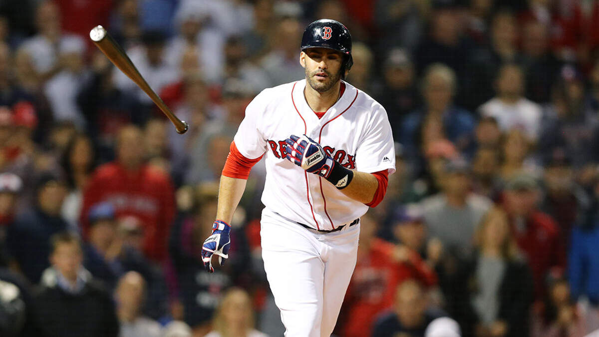 J.D. Martinez tosses his bat walking to first. (Maddie Meyer/Getty Images)
