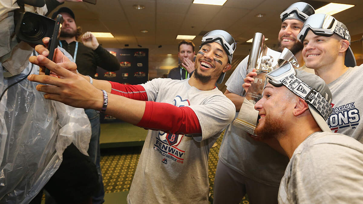 Mookie Betts celebrates with his teammates after winning Game Five of the ALCS. (Elsa/Getty Images)