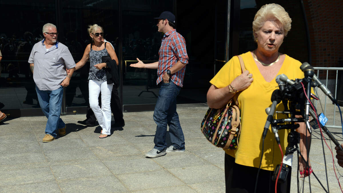 BOSTON - AUGUST 12: Patricia Donahue, wife of Michael Donahue, speaks to reporters as Steven Davis (L), brother of Debra Davis, walk by in background outside the John Joseph Moakley United Sates Courthouse following a guilty verdict against James 'Whitey' Bulger August 12, 2013 in Boston, Massachusetts. Bulger was found guilty on 31 of 32 counts of racketeering and acts related to murder. Bulger was convicted of the Michael Donahue murder while Debra Davis was the one murder that was found as 'No Finding.' (Photo by Darren McCollester/Getty Images)