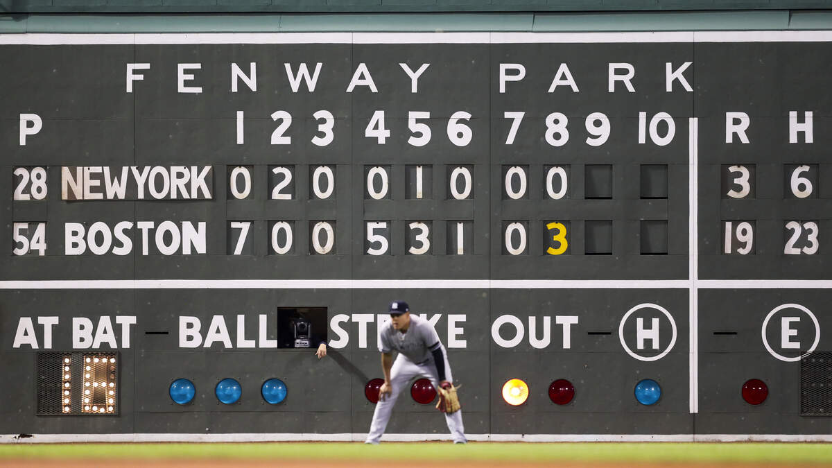BOSTON, MA - JULY 25: A general view of the Green Monster scoreboard showing the 19-3 score in the eighth inning of a game between the Boston Red Sox and the New York Yankees at Fenway Park on July 25, 2019 in Boston, Massachusetts. (Photo by Adam Glanzman/Getty Images)