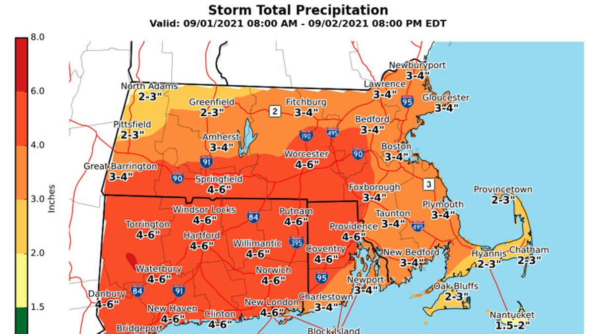 Update (9/1 @ 9:37 p.m.): The National Weather Service has issued a Flash Flood warning for Tolland and Windham counties in Connecticut and Southeastern Worcester county in Massachusetts until 5:30 a.m. Thursday.