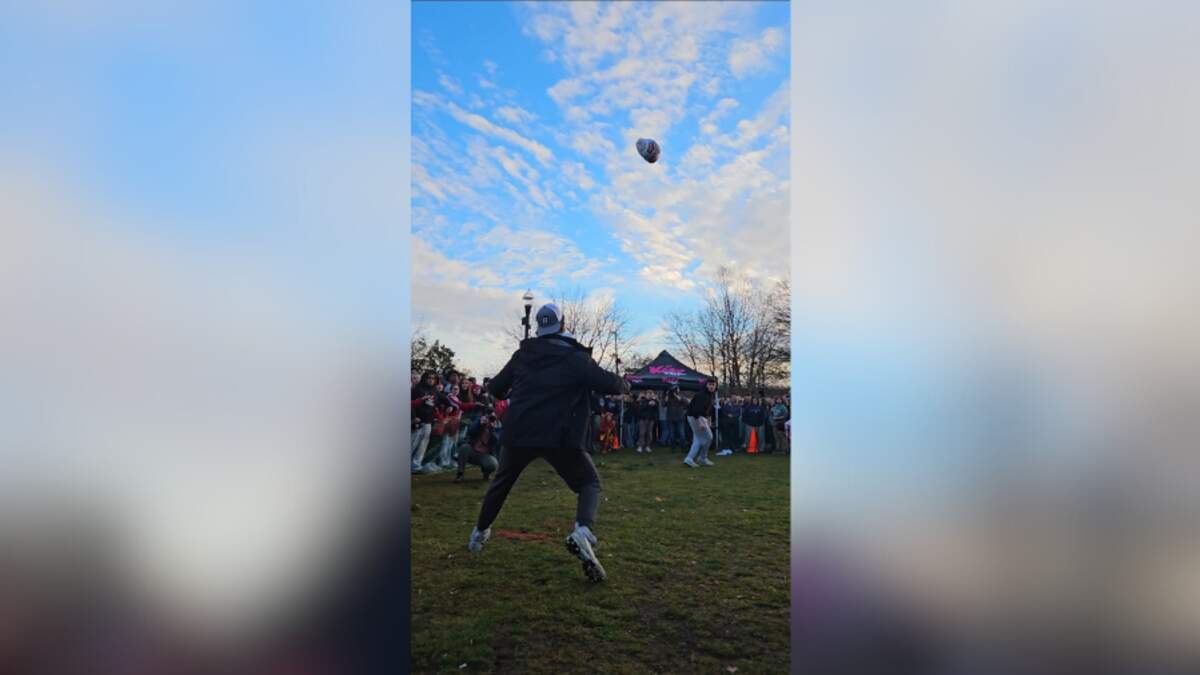 High school students all across the Commonwealth gathered at the Baxter Park Amphitheater at Assembly Row, with one student from each school attempting to toss a frozen turkey the farthest they can to another student.