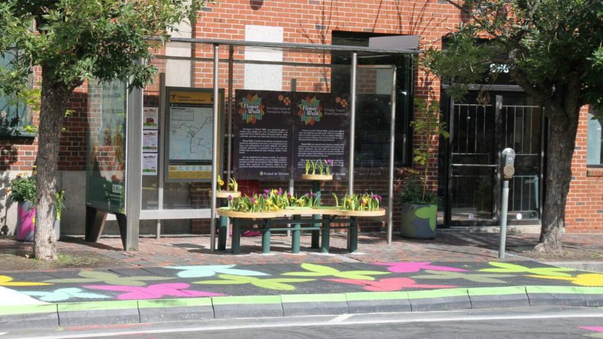 The new art installation called 'Flower Walk' at the bus stop on Broadway and 3rd St. includes eight native trees, 175 plantings, and hand-stenciled flowers along the street.