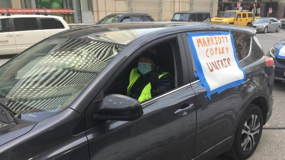 BOSTON (WBZ NewsRadio) — Marriott Hotel workers, who lost their jobs when the pandemic hit last year, staged a car caravan and picket line outside the hotel at Copley Place in Boston on Friday.