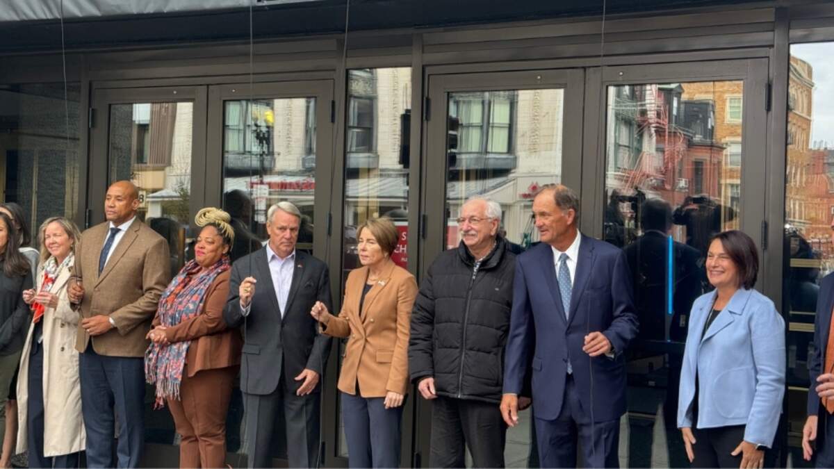 The signage spells out the facility's full name in gold letters across the building's black façade. It was unveiled at a ceremony Wednesday featuring Massachusetts Gov. Maura Healey and the family of John B. Hynes, who served in both World Wars and as Boston's mayor from 1950 to 1960.