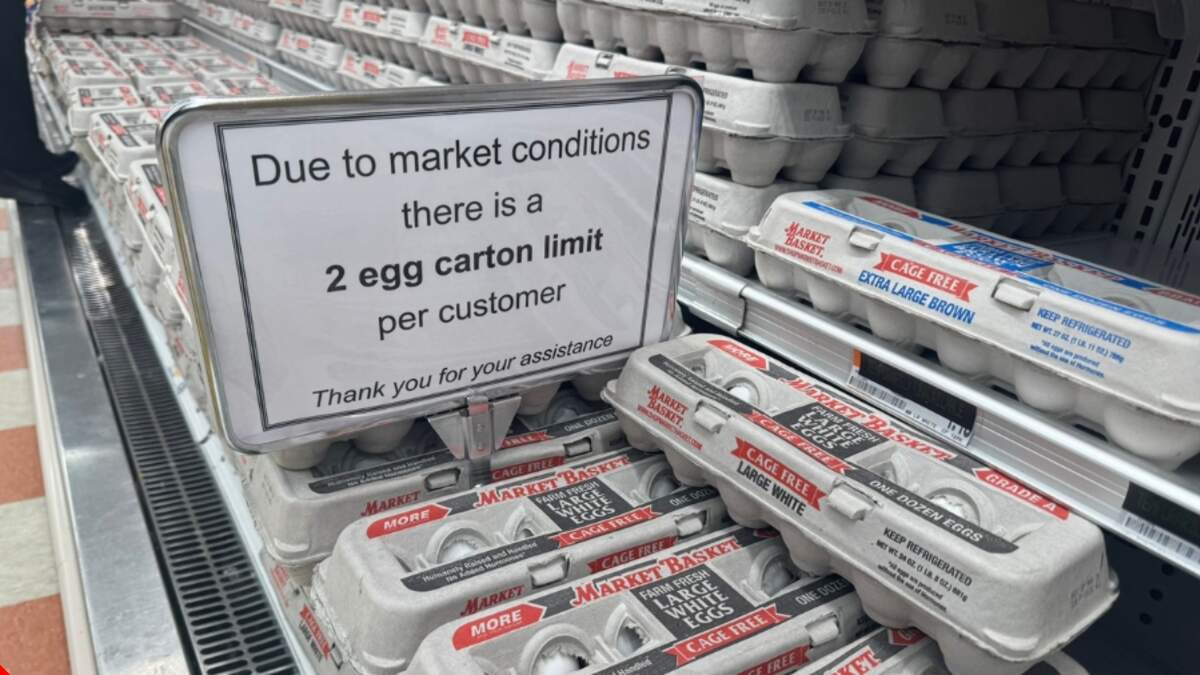 At the Market Basket in Hanover, Mass., signage indicates customers are only allowed to buy two cartons of eggs. Similar measures are being taken at other grocery stores both locally and nationally.