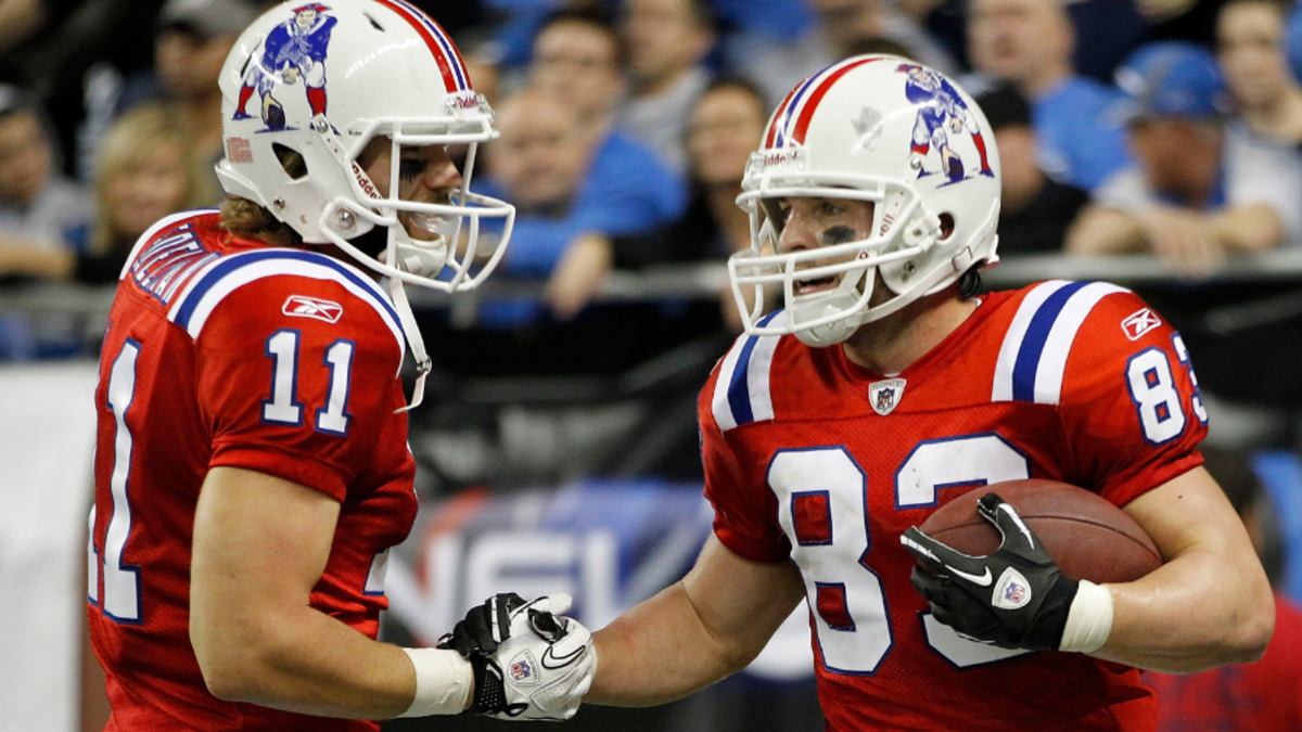Wide receivers Julian Edelman and Wes Welker wearing the throwback jerseys during a game against the Lions in 2012. Photo: Getty Images