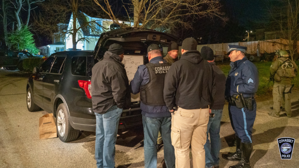 Officers from Cohasset Police look over a diagram of 37 Cushing Road during a barricaded suspect negotiation. Photo: Cohasset Police