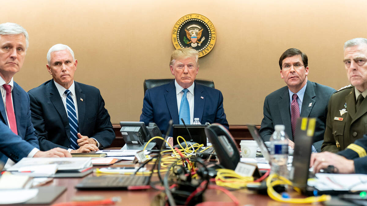 President Donald Trump, Vice President Mike Pence, National Security Advisor Robert O'Brien, Secretary of Defense Mark Esper, and Chairman of the Joint Chiefs of Staff U.S. Army General Mark A. Milley in the Situation Room on October 26. (Getty Images)