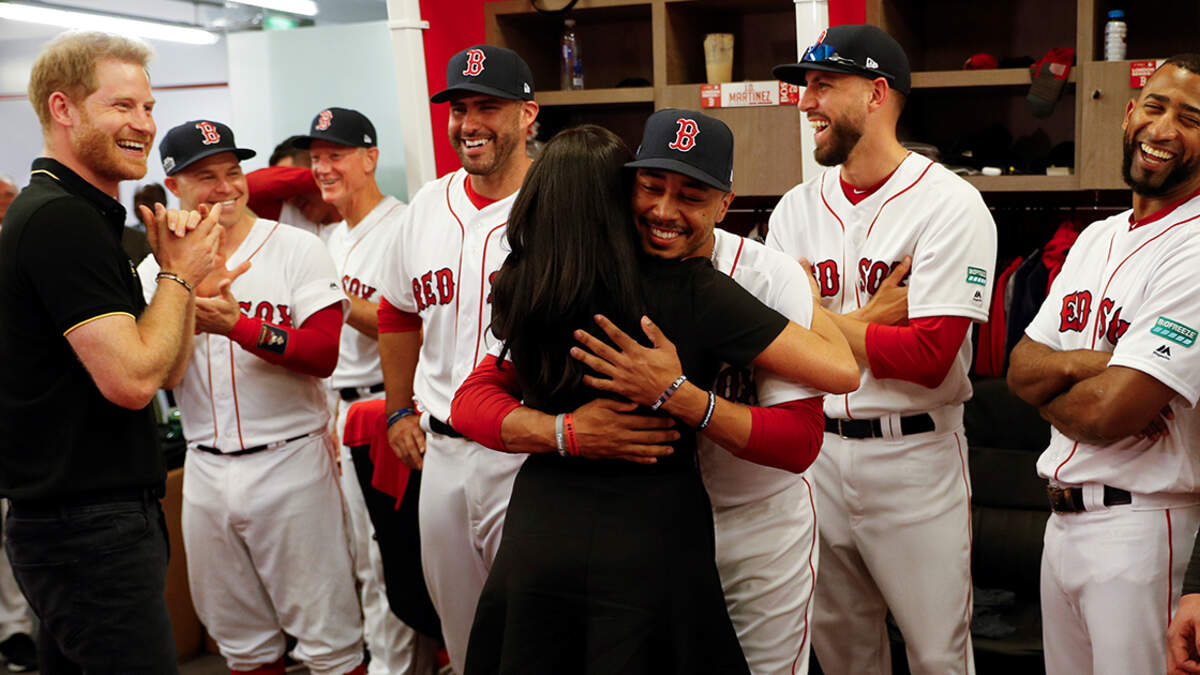 Prior to the game on Saturday, Prince Harry and Meghan Markle met with met with the Red Sox. Markle shared a hug with Red Sox right fielder Mookie Betts.