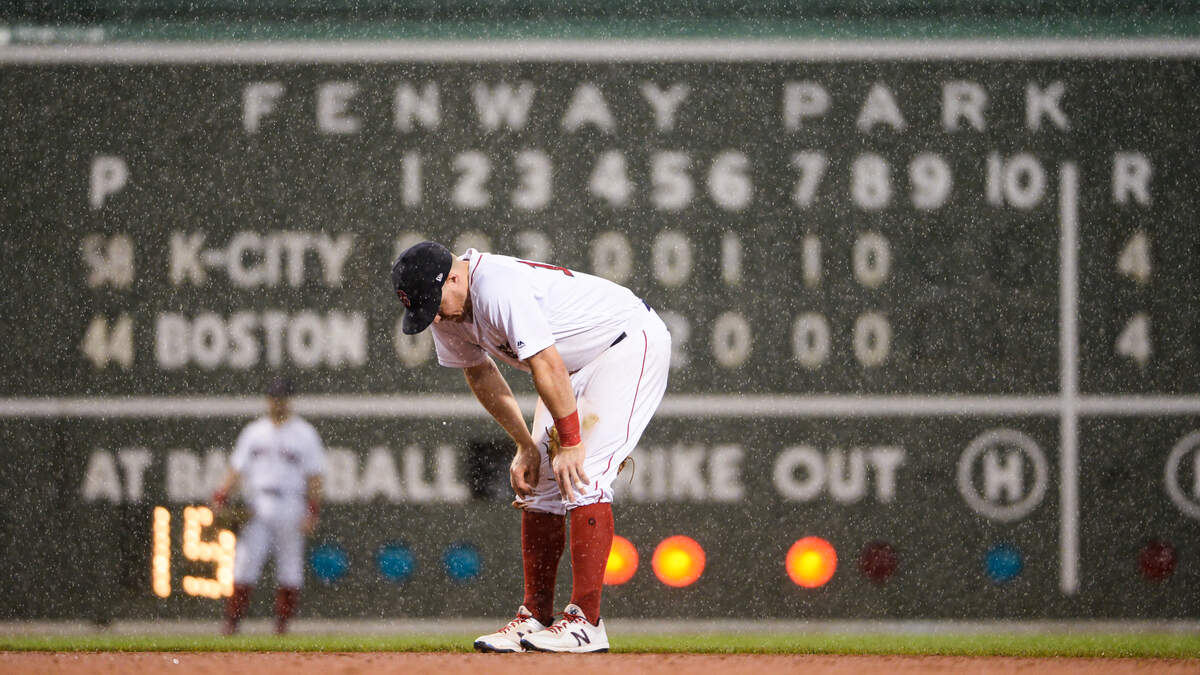 Rain started coming down in the eighth, though it stopped and started from there. It was coming down heavily in the ninth when J.D. Martinez came up with two outs and a runner on first.
