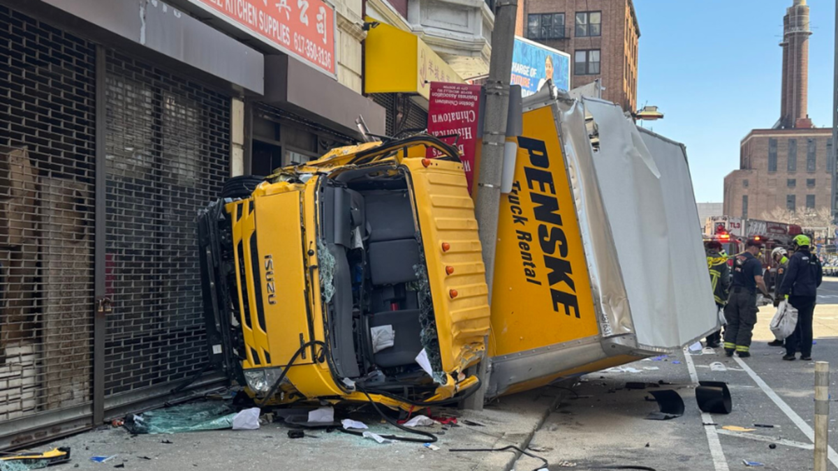 Boston Police officers responded to the intersection of Harrison Avenue and Kneeland Street after they got a call at around 12:48 p.m. about a box truck running into the side of a building. Boston Fire said the truck struck multiple poles along the street before becoming wedged between a pole and the building.