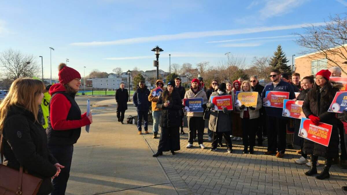Bay State educators assembled outside schools before the start of instruction to participate in a “walk-in” demonstration, which included a stop at Rumney Marsh Academy in Revere.